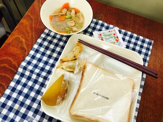 あげぎょうざ、鶏肉と冬瓜の中華煮、豊水なし、パン