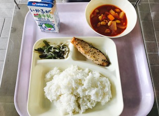さけのバジル焼き、大豆とごろごろ野菜のトマト煮、三度豆ともやしのサラダ