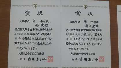 大阪市中学校総合文化祭、美術展に作品が出品された人の表彰がありました。19名の人が総合文化祭美術展の表彰を受けました。2年生は文字絵、3年生はDive into the 名画を制作しました。どれも素晴らしい作品です。