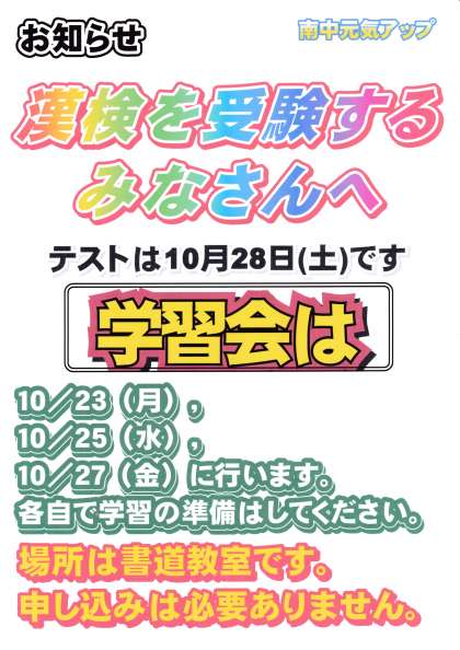 10月28日(土)に漢字検定が行われます。