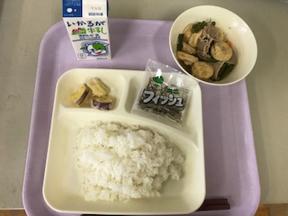 豚肉と一口がんもの煮物、さつまいものてんぷら ミニフィッシュ、牛乳、ごはん
