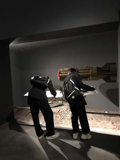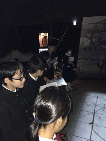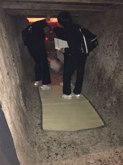 当時の防空壕の再現模型の防空壕に入ってみたり、焼夷弾のレプリカを見たり、色々な体験をしています。さぁ、何を感じるのでしょうか?