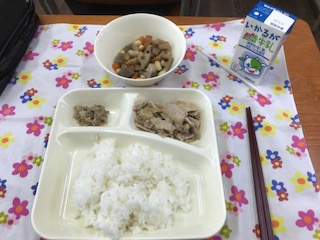 豚肉のごまだれ焼き、大豆の煮もの、切り干し大根のしそ甘酢づけ、 ごはん、牛乳