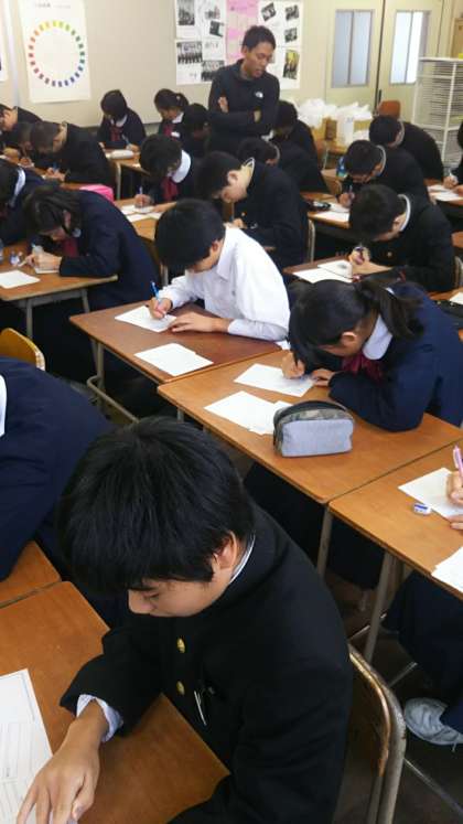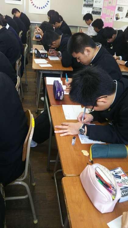 ということで、話をどれだけ聞き取れるのか確認とトレーニングをすることになりました。4人の先生が前で1分間スピーチをします。その要約と話の内容に関する問いの答えを書きます。『つけ麺のおいしさ』『謎の図形』『感動した本』『ある中学生の話』様々な内容に聞く方も必死で、お話が終わって3分間の記入時間になると、テストの時以上に緊迫した雰囲気でコッコッコッコッと筆記用具の音だけが教室に響きました。