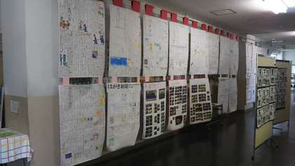 本校は様々な取り組みをした成果や教科・部活などの作品を、2学期末の懇談期間中に展示しています。2階の廊下を中心に展示していますが、美術室内や各学年の教室前にもあります。