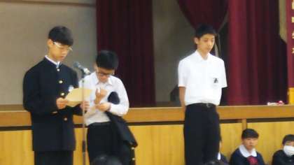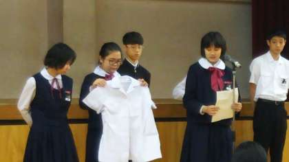 主に1年生に向けて、標準服の正しい着方や頭髪についての説明を生活委員の2・3年生が説明しました。すっかり暑くなりましたので、行事予定より繰り上げて、本日の帰校時より更衣調整期間とします。