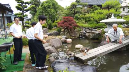 こちらのご家庭では、飼っていらっしゃる鴨と鯉にエサやりをしながら、昔のおもちゃ遊びを体験させていただきました。