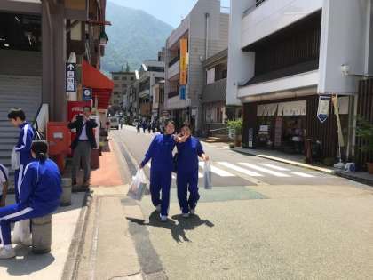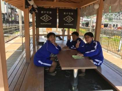 足湯につかったり、お土産を買ったり、班ごとに楽しんでいます。