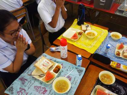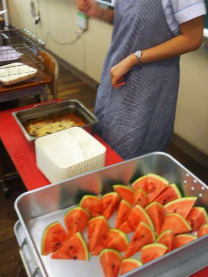 今日の献立は、かぼちゃのミートグラタン、スープ、すいか、食パン、