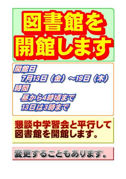 懇談期間中に学習会と図書館を開きます。詳しくはポスターをご覧ください。
