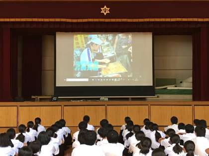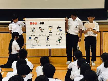 保健委員会が 紙芝居を使い、熱中症について、わかりやすく解説してくれました。途中、演技も交えて、レベルアップしたすばらしい紙芝居でした。次に、本校のパソコン部員が作った 職場体験学習のムービーを鑑賞しました。1学期は一泊移住、職場体験学習など、大きな行事があり、その度に学んだ事が多々あった事を改めて振り返りました。続いて、学習や生活面のお話を、暑い体育館の中でしたが、真剣に聞いていました。