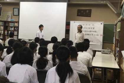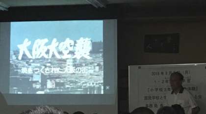 吉田さんは、小学生の頃、大阪市高津国民学校に在籍されていましたが、戦況の悪化に伴い、滋賀県へ学童疎開されました。その頃の様子や、現在に至るまでの国民の暮らしの変化についてなど、深く幅広く語って下さいました。また、以前本校で撮影された大阪大空襲についての動画や、パワーポイント、紙芝居など、色々な手法で資料を見せてくださいました。特に紙芝居は、疎開中の過酷な毎日における苦しみや、家族を失う絶望感、喪失感、深い悲しみを、情感を込めて読んでくださいました。今日お聞きしたお話を、聞かせていただいた一人一人が、また語り継げるように、しっかりと記憶に留めておかなければならないと思いました。