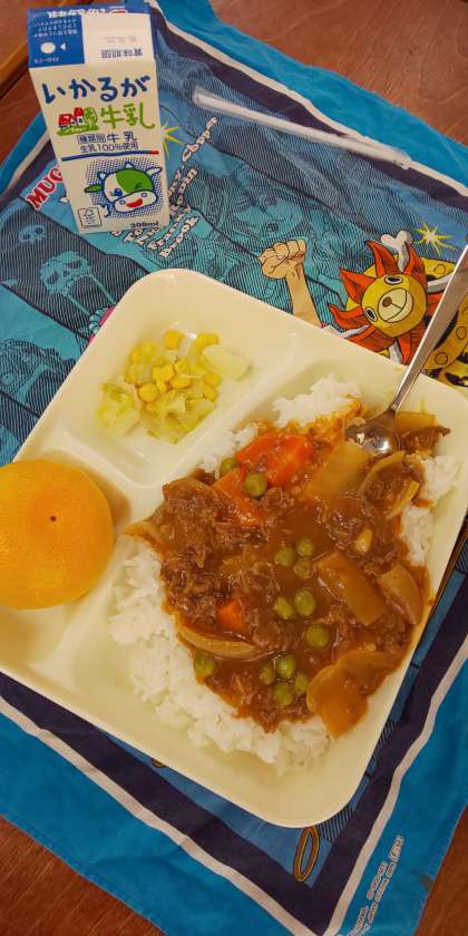 今日の献立は、ハヤシライス(米粉)、キャベツとコーンのサラダ、みかん、ご飯、牛乳です。