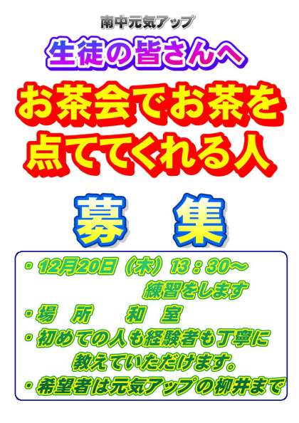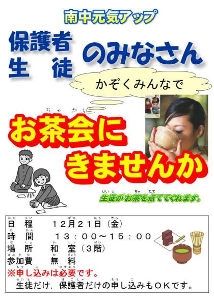 毎年恒例のお茶会を行います。多くの保護者の方や生徒の参加をお待ちしています。