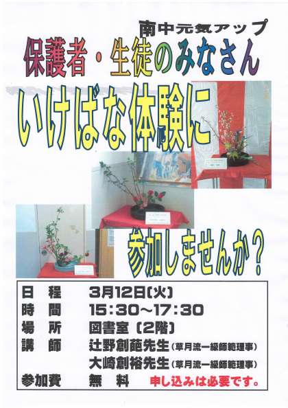 生け花体験を通して日本の美にふれ,卒業式に校内に飾り,卒業生の門出に華を添えたいと思います。多くの保護者,生徒(3年生も含む)の皆さんの参加をお待ちしています。