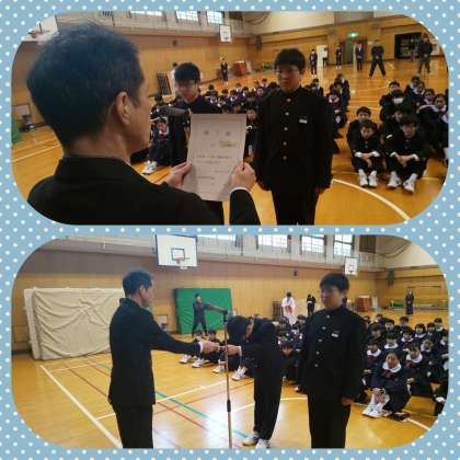 校長先生から、1年生と2年生の代表生徒に、修了証が手渡されました。