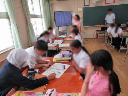 5時間目の授業を見学いただきました。写真は、1年生の英語の授業です。C-NETの先生と英語ですごろくをして大盛り上がりでした。