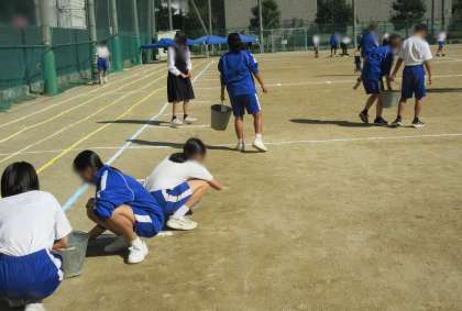 本日午後から、全校生徒で、明日の体育大会へ向けて会場の準備をしました。