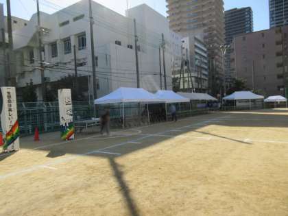 テントや座席の設営や横断幕張り、または、みんなが競技・演技がしやすくなるようにグランドの石拾いまで手分けして行いました。