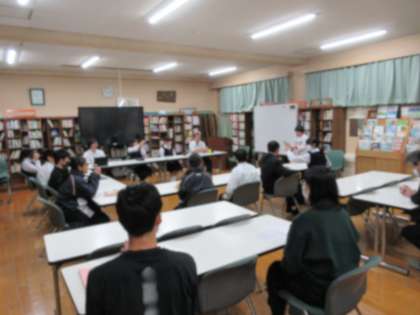 写真は、生徒会役員会、図書委員会、体育委員会の様子です。