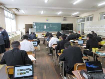 (写真右)美術の授業(3−1)です。愛鳥週間のポスターを作成しています。