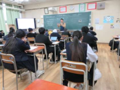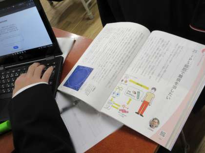 「iPS細胞で難病を治したい」という教材を読んで、「自分ならどう考えるか」と考えました。考えたことを、タブレットに記入し、記入したことを教室の電子黒板を使って、みんなで共有しました。様々な考えがあることを知りながら、これからの進む道について考えました。
