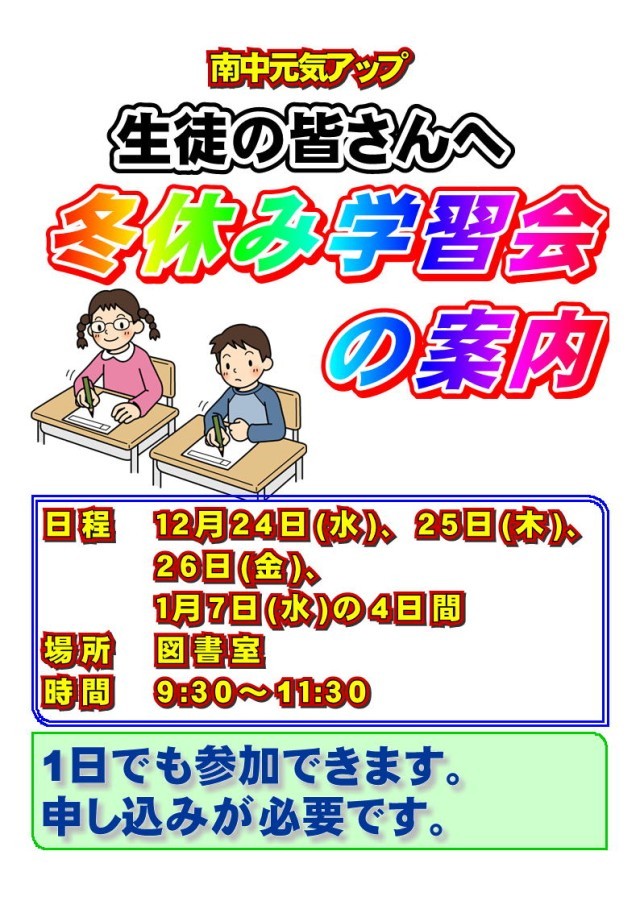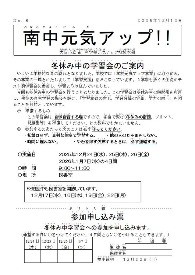 冬休み前と、冬休み中の元気アップのお知らせです。