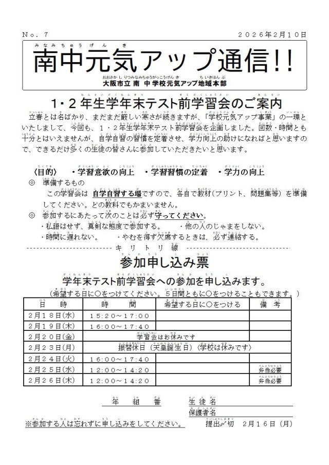 学年末テスト 元気アップのおしらせ