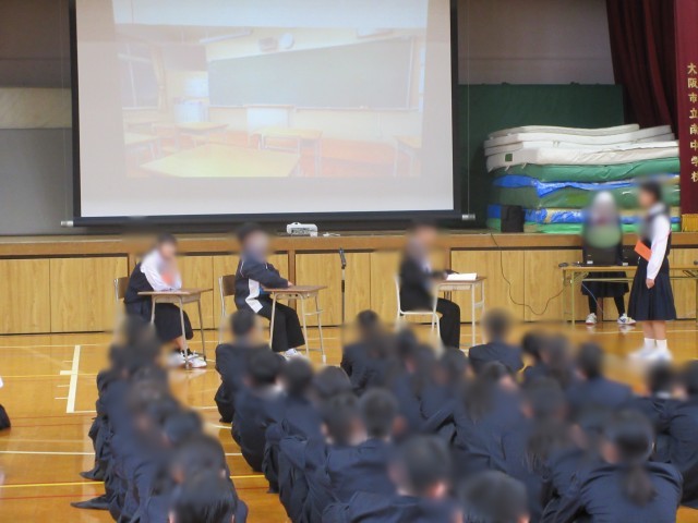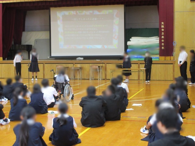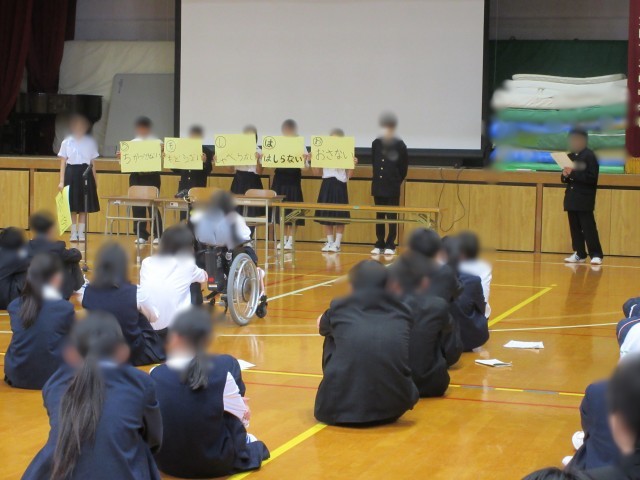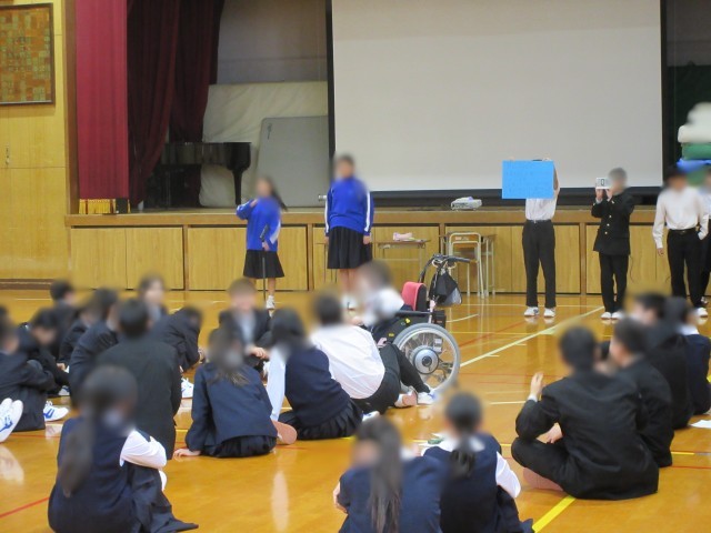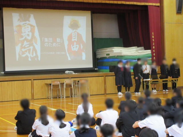 「集団“考動”とはどういうことか」について、「仲間を大切にすることとはどういうことか」「人と人のつながりについて」「より良いコミュニケーションの取り方」「トラブル場面での考動について」「SNSの適切な使い方や噂などへの対応」「防災について」など、各項目ごとに、2年生が班で具体的に説明をしてくれました。クイズや劇、動画によるオリジナルダンスを取り入れるなど、とても工夫を凝らした素晴らしい発表でした。