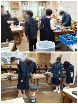2時間目、1年2組は、技術です。 木材の切断面を整えている子、切断した木材を先生...