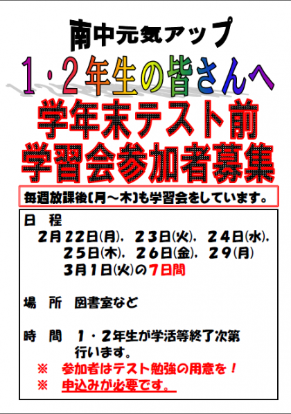2/15(月) 1・2年生学年末テスト前学習会の案内