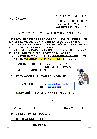 『PTAソフトボール部』部員募集案内で、7月第一週に大会というのは、『女子バレー...