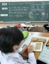 2時間目、2年1組は美術です、彫刻刀で浮き彫りをしています。