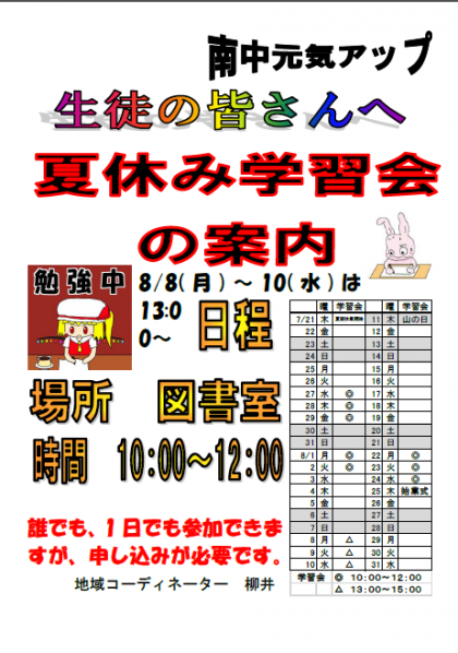 夏休み学習会を今年も行います。夏休みの宿題や自由課題,塾の宿題など 自分で学習課...