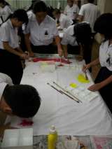 放課後、運動会で使う学級旗の色ぬりをしました。 学級でデザインを決定し、係生徒が...