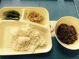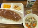 鶏肉とてぼ豆のスープ煮、じゃがいもとトマトのチーズ焼き、黄桃、パン、牛乳
