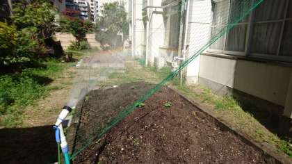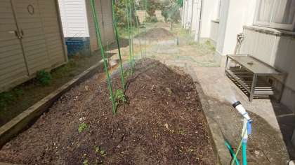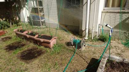 先週植えたキュウリ・プチトマト・ナスの苗へ、毎日朝夕に当番を決めて「水やり」の世話を続けています。