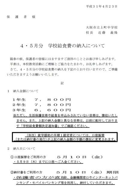 なお、5月分学校給食費の銀行振替は、「5月10日(金)」になっておりますので、前日までに学校に届出の口座へご入金くださいますよう、お願いいたします。