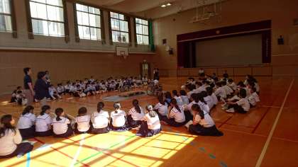 次は、講師の中央区社会福祉協議会「もも」の職員の方が、生徒を乗せた車椅子を押して、デモンストレーションを行いました。(写真上)