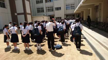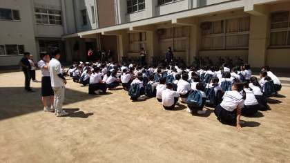 5限目の予鈴で中庭に集合し、諸注意の後、各班に付き添う2年教員・中央区社会福祉協議会「もも」職員・地域福祉コーディネーター(今年度より参加)を紹介しました。