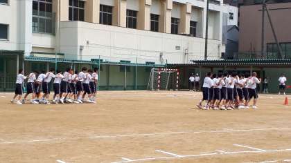 午後になって風は止み日差しも強くなり、生徒達の活躍に熱が入るのを後押しするような暑さとなりました。応援合戦では各クラスとも優勝を目指す姿を力強く表現しており、とても惹きつけられました。