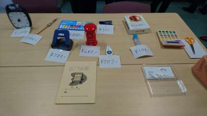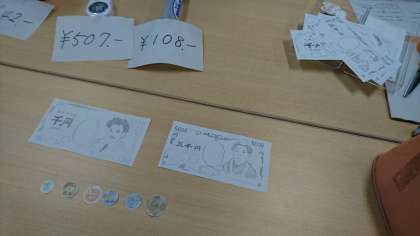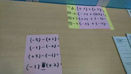 写真左は「正負の計算」、写真中・右は「お金の計算」の手作り教材です。