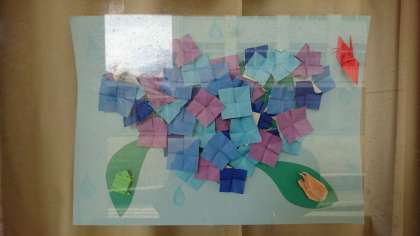 青空学級では、折り紙でアジサイのポスターを作りました。