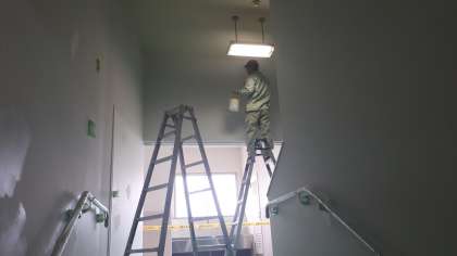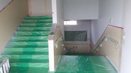 学校園営繕事業で、校舎の階段の壁の塗装作業が始まっています。場所は、南校舎の東側階段です。来週の前半には、作業が終了します。いつまでも美しく、きれいな校舎で学習ができるよう意識を高めましょう。