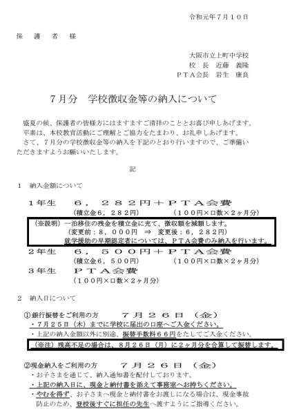 なお、7月分学校徴収金の銀行振替は、「7月26日(金)」になっておりますので、前日までに学校に届出の口座へご入金くださいますよう、お願いいたします。