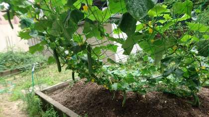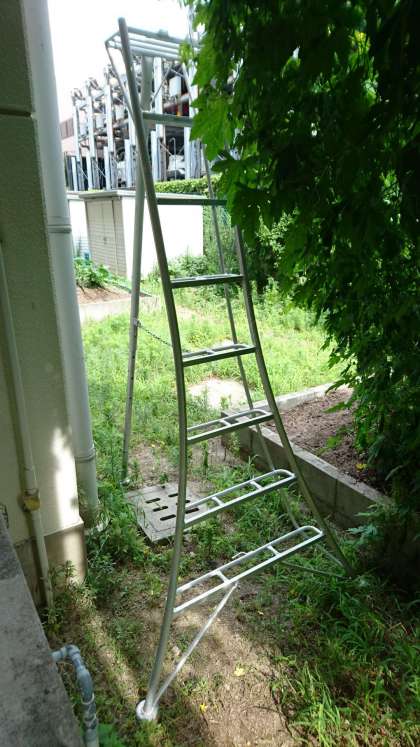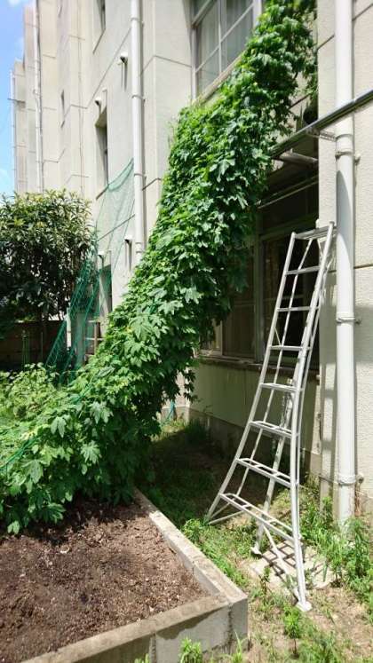 ゴーヤとキュウリによる「緑のカーテン」は良かったのですが、高過ぎて手の届かない所にある実は、管理作業員さんから脚立を借りて収穫しています。