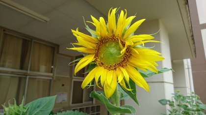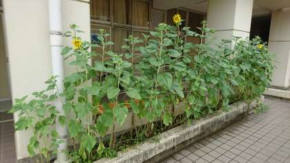開花が遅れていた中庭のヒマワリが、お盆休みの間に、やっと開花し始めました。
