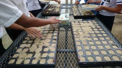 9/13(金)放課後、生徒会と園芸部が合同で、中央区役所・大阪城公園事務所・ボランティアの方々と連携し、「秋の種花活動」の取り組みとして、キンセンカの小さな種をパレットに植えました。