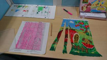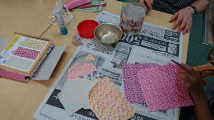 いよいよ1週間後に迫った文化活動発表会に向け、青空学級でも展示発表用の手芸作品を、急ピッチで仕上げています。