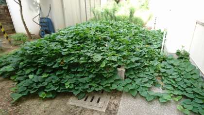 青々と生い茂った裏庭畑から、「芋づる式」に大小100個以上のサツマイモを収穫しました。